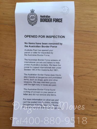 第一次與海龍國際合作,沒有想到我委托的貨物這么快就從沈陽送到澳大利亞了。包裹在澳大利亞郵局被開包檢查了,主要是查看有沒有郵寄毒品和槍支彈藥等違禁物品,檢查后在包裹內留下開箱檢查的告知單。今天早上就把包裹送達客戶了。感謝客服的徐金鑫先生耐心的解答。