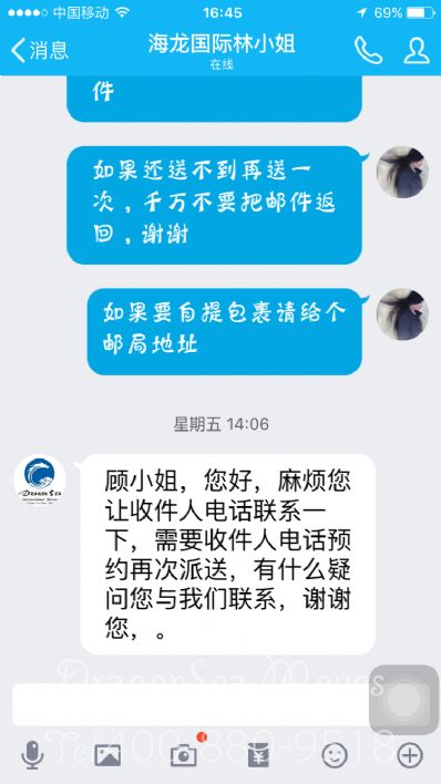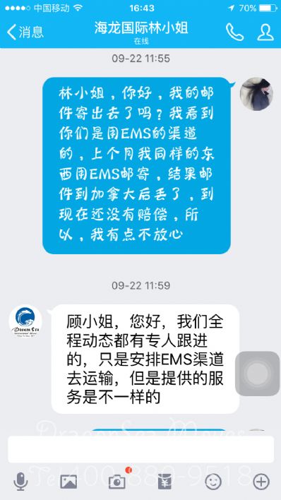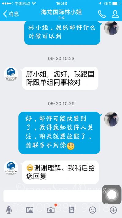 這是一個(gè)專業(yè)的國際快遞公司,有專人服務(wù),有專人跟單,不用擔(dān)心會(huì)丟失郵件,對(duì)客服林小姐的服務(wù)很滿意,下次還來這個(gè)公司郵遞快件!