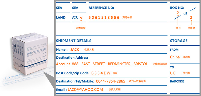 包裝前您需要在箱嘜兩側(cè)完整地填寫收件人信息和海龍單號,請按下圖指導(dǎo)信息填寫完整,利于派送。