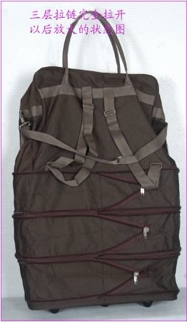優(yōu)點:用完收起來不占地方;可多次使用;可收放成大、中、小3種尺寸的包使用;有輪子可以拖動