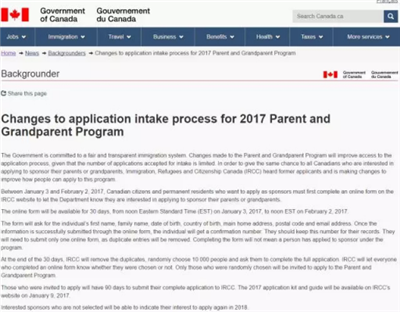 移民搬家到加拿大,移民部門表示,每年父母祖父母團(tuán)聚移民(PGP)的申請(qǐng)者都遠(yuǎn)遠(yuǎn)超過限定的配額,因此采取抽簽的方式對(duì)所有申請(qǐng)者更公平。移民部長(zhǎng)麥家廉(JohnMcCallum):"我們聽取了許多在過去收到的反饋。我們認(rèn)為,新的規(guī)定將能夠更合理的解決那些希望和父母團(tuán)聚的加拿大公民需求。"自2017年1月3日到2月2日,申請(qǐng)父母團(tuán)聚移民加拿大的居民將必須在30天內(nèi)填寫一份線上申請(qǐng)表。