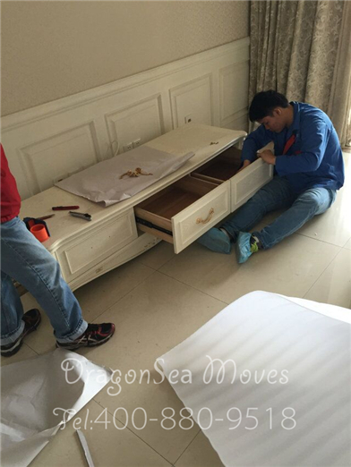 邱大師正在對電視柜抽屜做處理,為了防止抽屜把手在包裝過程中損壞,包裝之前都會拆下抽屜把手反裝: