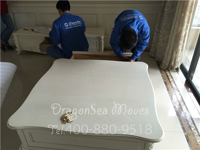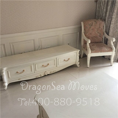 這是客戶家需要包裝的家具,有電視柜,一套沙發(fā),一個方形茶幾及幾張餐椅,都是乳白色漆面,跟房間內(nèi)部裝修渾然一體,很搭的樣子