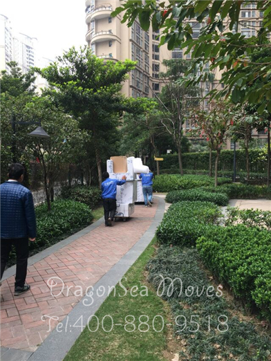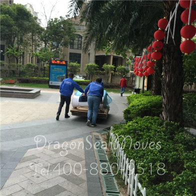 師傅們用萬向平板車把包裝好的家具運出小區(qū)并裝車,這個客戶的包裝工作就算完成了: