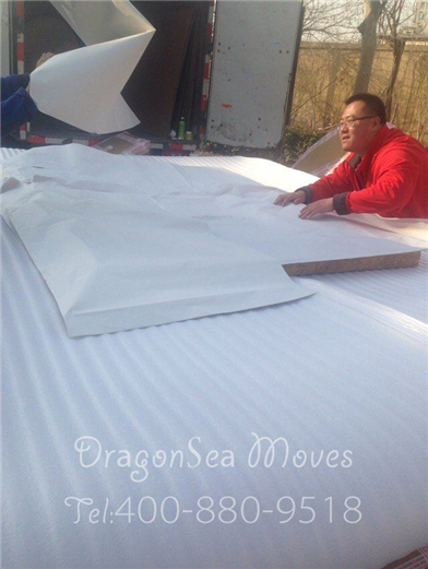 幾個(gè)師傅正在包裝床頭,床頭邊緣使用了紙皮特別加固,防碰撞