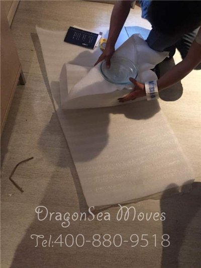 我們可以看到客戶的柜子上有著多種成套的茶具、杯具、餐具,皆是統(tǒng)一的山水風(fēng)景的紋路,韻味雅極,還有一摞中國(guó)紅的碗,搭配起來(lái)甚是好看。為了妥善的包裝這些易碎的物品,我們的包裝師傅可是極其的小心呢。