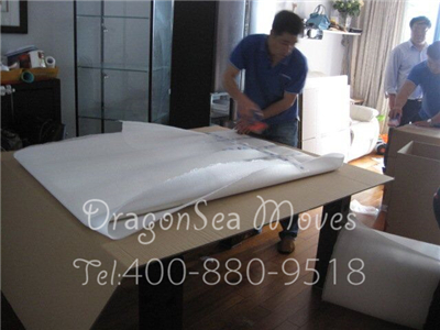 由于餐桌比較大,可以拆卸。為了更好的節(jié)省物品體積以及保護物品安全,包裝師傅把餐桌拆成桌板和木質(zhì)框架兩部分,分別進行“棉白紙-珍珠棉-五層紙板”妥善包裝。