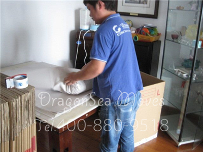包裝師傅以著熟練的技巧,細致地妥善包裝客戶家中的物品。