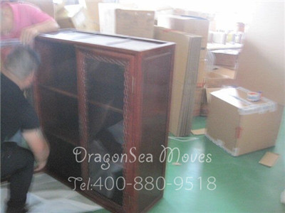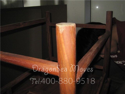 包裝完成時候,包裝師傅正在把紅木家具搬到合適的位置。