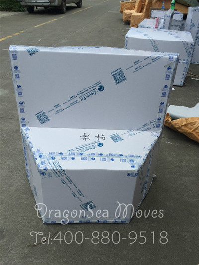這次海運(yùn)門到門到美國的客戶的戶外家具較多,大部分以塑料材質(zhì)為主,重量較輕、搬運(yùn)起來也較為方便。而且,靠背椅是可以拆卸的,等到了美國再重新組裝。包裝師傅將椅子簡單的拆卸后,很好的節(jié)省了物品占用的體積。首先,將椅子用棉白紙包裹,然后用珍珠棉仔細(xì)的包裹兩層。接著用五層紙板根據(jù)靠背椅的形狀制作紙箱,用強(qiáng)力封箱膠帶封口,保障物品在海運(yùn)到美國洛杉磯的安全。