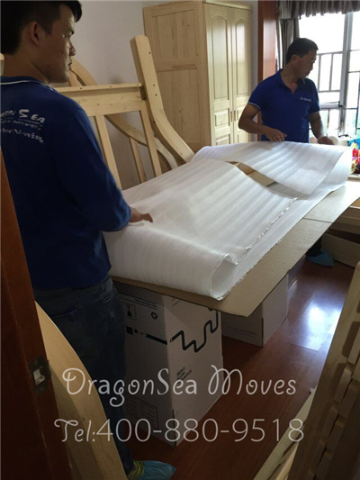 兩個包裝師傅合作包裝大件家具,使用珍珠棉包裹后膠帶加固