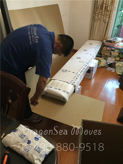 小剛正在包裝家具,珍珠棉包裹防震