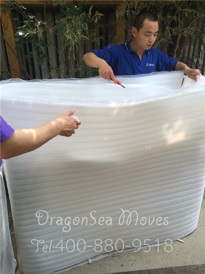 再使用珍珠棉均勻包裹,兩個(gè)師傅合作進(jìn)行包裝