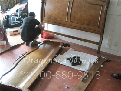 床組拆卸后進行包裝,師傅正在包裝床頭
