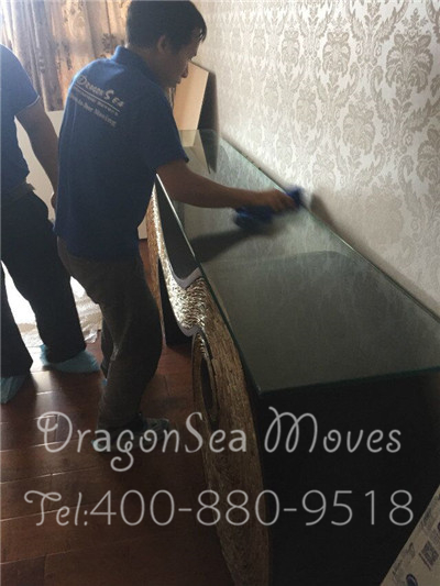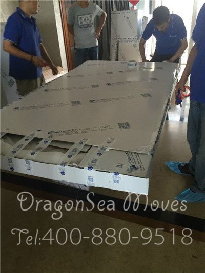 包裝完畢,大理石桌面太沉,幾位師傅把桌面抬走