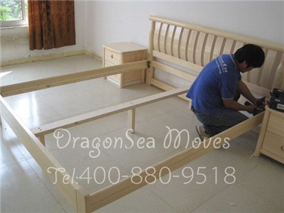 包裝師傅們正在拆卸床組,床組在包裝之前需要先化整為零拆成零件包裝,到了目的國再進(jìn)行組裝,這主要是由于床組整體包裝太浪費(fèi)體積,并且床組接合部位一般都比較脆弱,整體運(yùn)輸對(duì)床組損害太大,拆卸成零件包裝反而是一種有效的保護(hù)方式