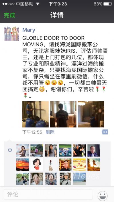 GLOBLE DOOR TO DOOR MOVING,請找海龍國際搬家公司,無論客服妹妹IRIS、評估師帥哥王,還是上門打包的幾位,都體現(xiàn)了專業(yè)和職業(yè)精神。漂洋過海的搬家不復(fù)雜,只要找海龍國際搬家公司,你只需坐在家里刷微信,什么都不用管[調(diào)皮][調(diào)皮][調(diào)皮],一切都由帥哥天團搞定[呲牙]。謝謝你們,辛苦啦[玫瑰][玫瑰][玫瑰]。