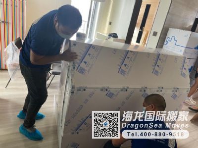 國際搬家龍頭企業(yè)果然就是不一樣,無論包裝的材料和包裝工人的專業(yè)性,都是我們目前看到最好的,師傅有條不紊的開展包裝, 邊角使用硬質(zhì)護(hù)角做好防護(hù),在使用專用紙板進(jìn)行包裝,感謝現(xiàn)場幾位師傅和陳督導(dǎo)的服務(wù),也感謝客服顧問袁經(jīng)理,后面的就交給你們了,祝海龍生意興隆!