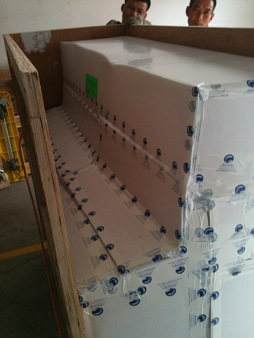 5在包好防震泡膜和珍珠棉后,用了硬紙板包裹,做了一個大小剛好合適的鋼琴形狀的紙箱把鋼琴裝裹起來,真是佩服那幾個包裝師傅啊,兩塊大紙板就可以裁出一個那么合適的紙箱。