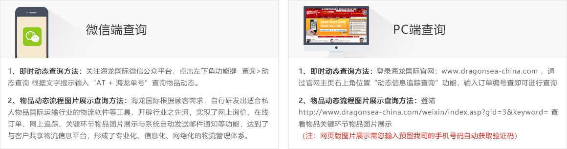 海龍國際根據(jù)顧客需求,自行研發(fā)出適合私人物品國際運(yùn)輸行業(yè)的物流軟件等工具,開辟行業(yè)之先河,實(shí)現(xiàn)了網(wǎng)上詢價(jià)、在線訂單、網(wǎng)上追蹤、關(guān)鍵環(huán)節(jié)物品圖片展示與系統(tǒng)自動發(fā)送郵件通知等功能,達(dá)到了與客戶共享物流信息平臺,形成了專業(yè)化、信息化、網(wǎng)絡(luò)化的物流管理體系。