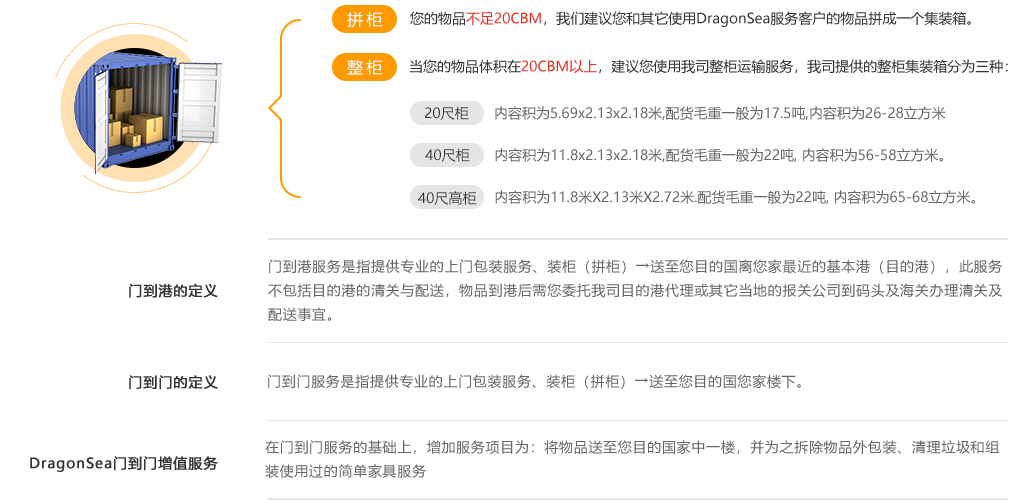 海龍DragonSea國際搬家拼柜計(jì)費(fèi)方式為1CBM起運(yùn),不足1CBM按1CBM收費(fèi),超過1CBM按實(shí)際體積收費(fèi),1CBM限重為350KG。