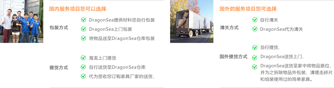您的物品到港前一星期左右,DragonSea國外公司或國外代理公司,已根據(jù)我們提供過去的材料為您做好清關(guān)資料,屆時(shí)將通過郵件和傳真的形式遞送于您簽名確認(rèn),在收到您回傳的簽名確認(rèn)文件后,會在您物品到港后的第一時(shí)間辦理清關(guān),清關(guān)完成后,會按照您預(yù)約的時(shí)間派送至您家中,并且拆除外包裝及清理垃圾,組裝簡單的舊家具服務(wù)。